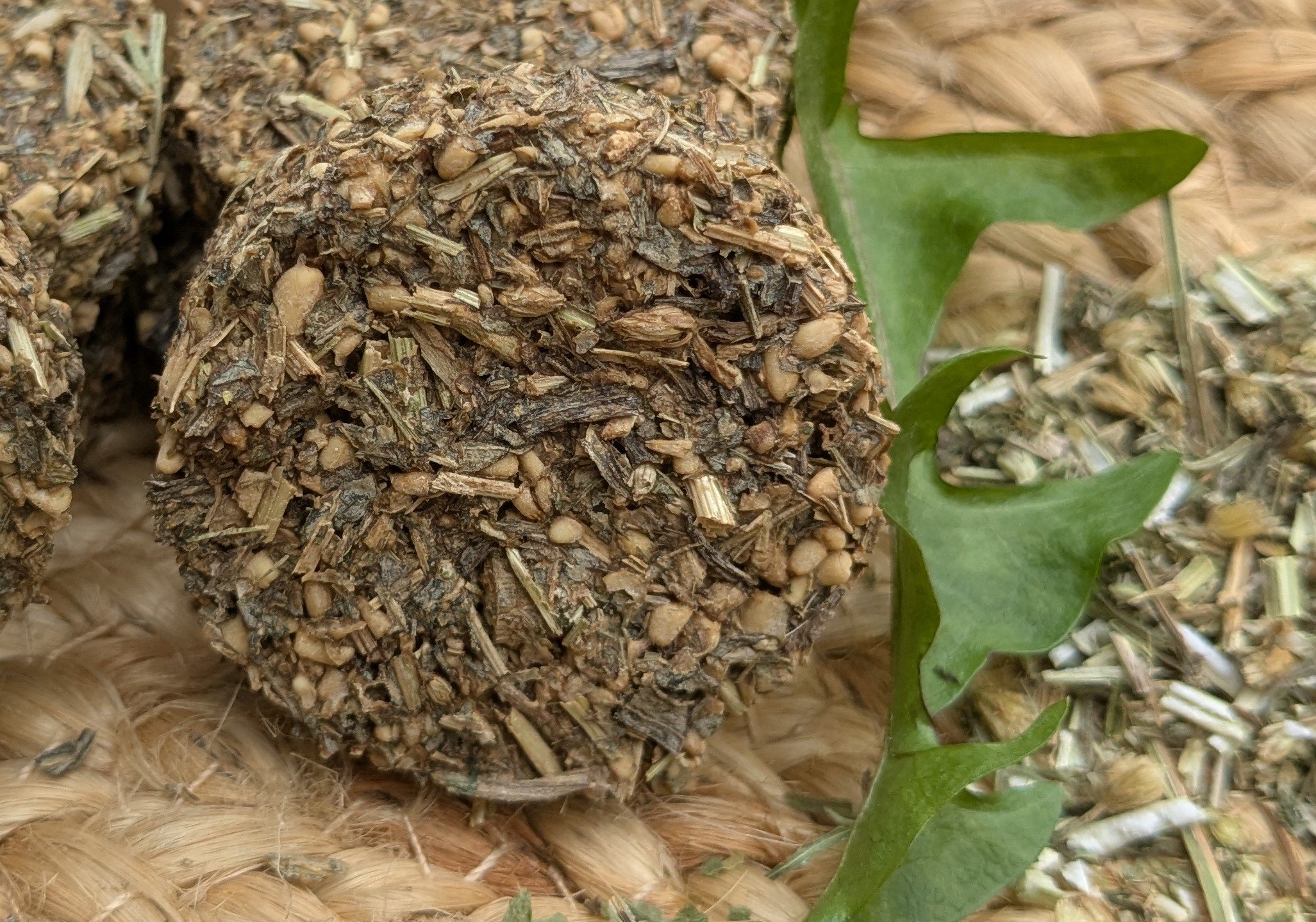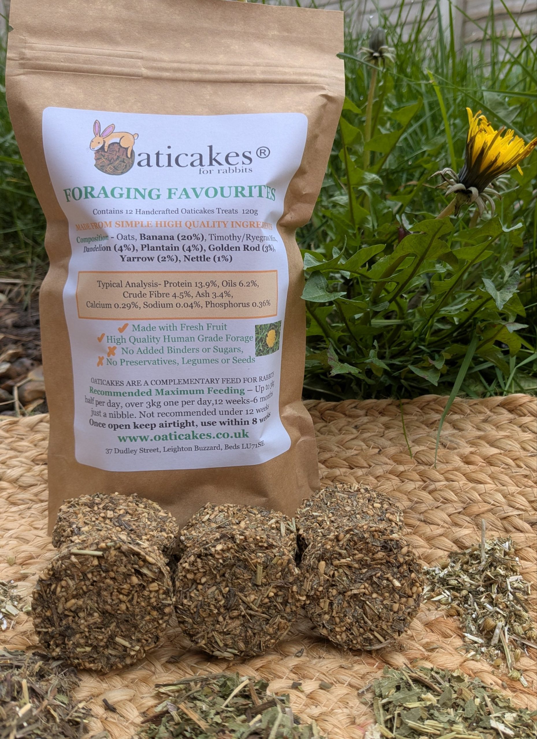 Composition – Oats, Banana (20%), Timothy/Ryegrass mix, Dandelion (4%), Plantain (4%), Golden Rod (3%), Yarrow (2%), Nettle (1%)